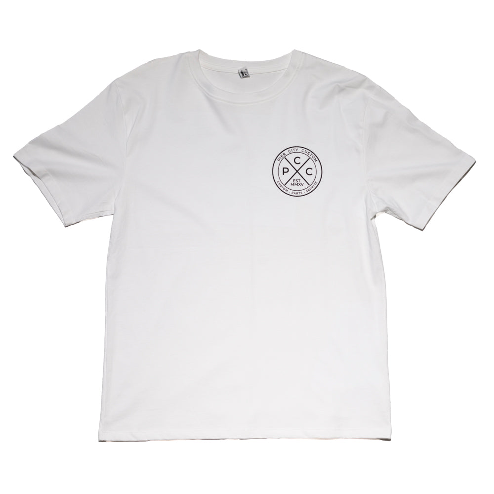 Hicimos algunas camisetas de PCC. Todas están serigrafiadas a mano en una imprenta local independiente, con un tejido suave y ligero de 100 % algodón, perfecto para usar en el taller, en la ciudad o debajo de una chaqueta en un día caluroso. Estas camisetas llevan nuestro logotipo en la parte delantera y nuestros detalles en la trasera.